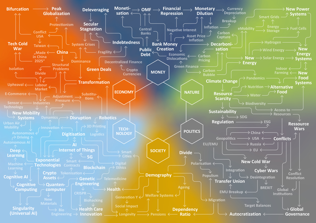 Our six knowledge areas (Money, Economy, Nature, Politics, Society and Technology) act as central scenario drivers. As cognitive spaces, they structure our mission map. They also create connections between the individual areas and thus generate a neural scenario image.