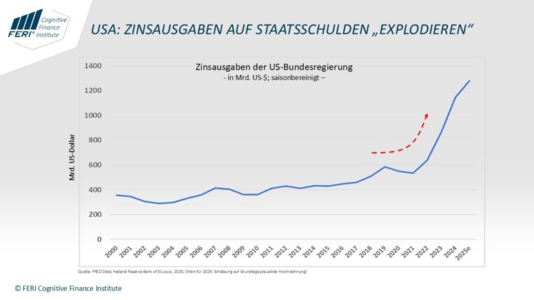 Die massiv gestiegene Staatsverschuldung wird für die USA immer mehr zum akuten Problem, denn: Allein für Zinszahlungen auf US-Schulden wird im Jahr 2025 ein Rekordwert von rund 1,3 Billionen US-Dollar erwartet – deutlich mehr als das gesamte Militärbudget der USA!